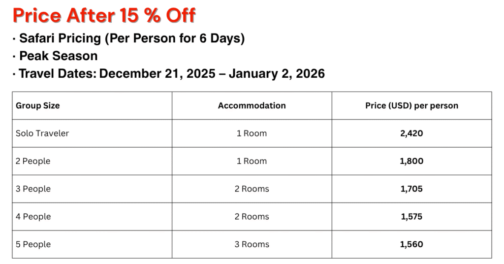 To save 15% on Your African Safari Adventure, send your discount code to the tour consultant you are in communication with