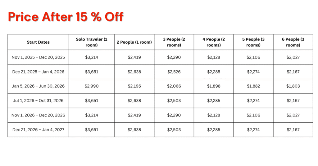 • All accommodations listed (unless clearly stated as optional upgrades)