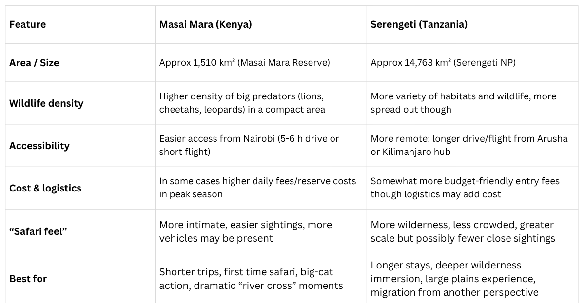 Because the Serengeti is much larger, you’ll feel more “out in the wild” — but also driving distances may be longer to spot animals.